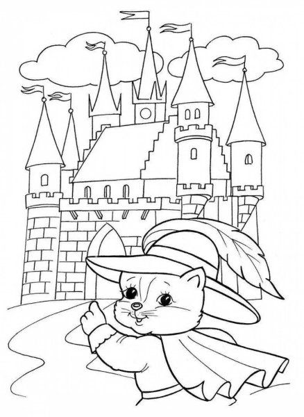 Раскраска кот в сапогах и замок