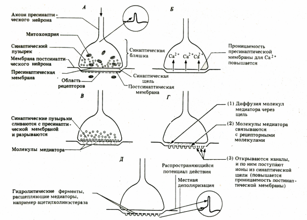 Этапы передачи возбуждения в химических синапсах